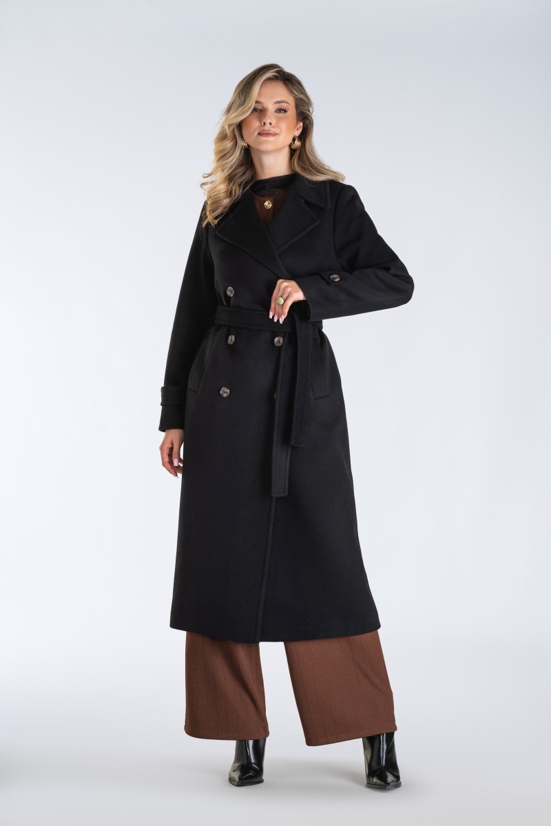 M548 – wełniany długi płaszcz damski dwurzędowy z paskiem - czarny