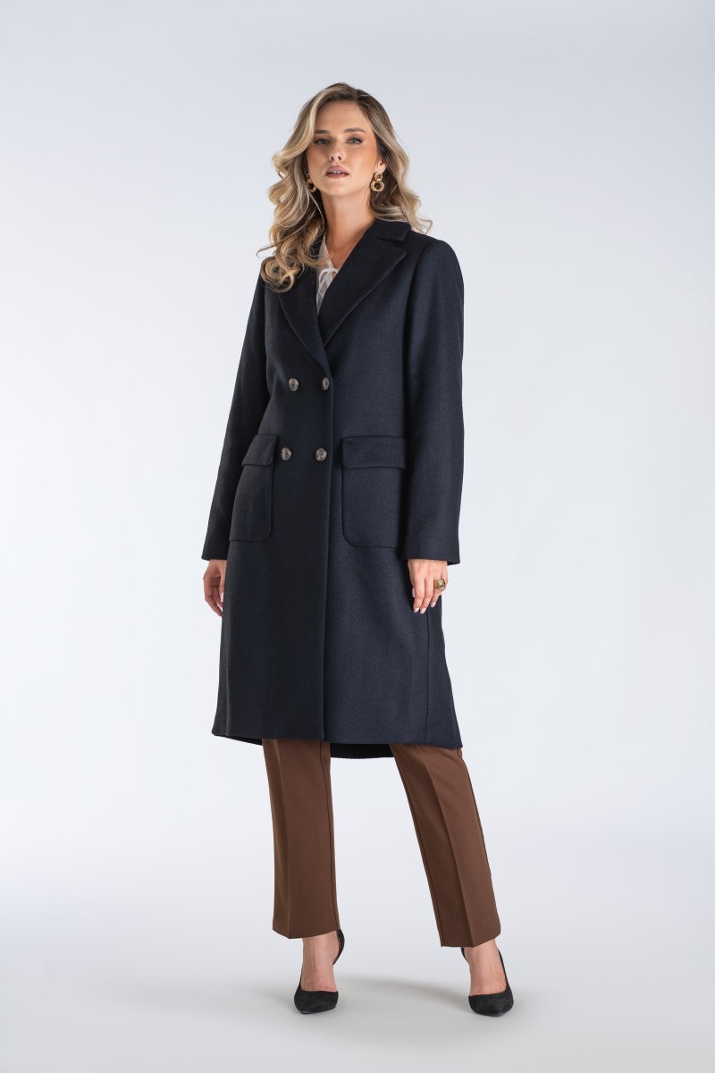 M574 – elegancki, dwurzędowy płaszcz damski, który łączy klasykę i nowoczesność.